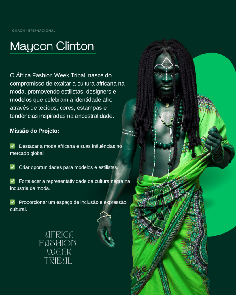 Maycon Clinton trouxe para a passarela o conceito de Black Royalty. Ele desafia a visão eurocêntrica de que a moda africana é apenas “étnica” ou “exótica”, posicionando-a como alta costura e símbolo de poder. Sua curadoria busca designers que misturam o luxo contemporâneo com tecidos carregados de história.